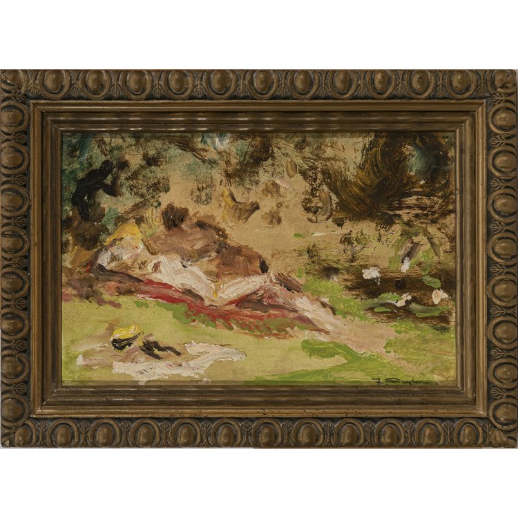 Liebespaar im Wald. Öl/Karton. 14 x 21,5 cm. Sign.