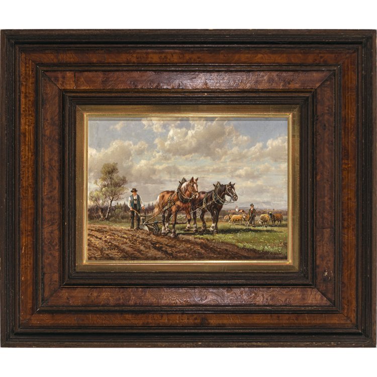 Bauer mit Pferdepflug auf dem Feld. Öl/Holz. 12,8 x 17,8 cm. Sign.