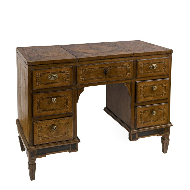Deutsch, um 1800. Nussbaum und andere Furnierhölzer. Auf Vierkantfüßen geradliniger Korpus, Front mit Knieaussparung und sieben Schüben, drei davon blind, oberseitig dreifach aufklappbar. Spiegel fehlt. Schubladen mit Zentralverriegelung. Auch als Schreibtisch nutzbar. 76 x 100 x 46 cm.