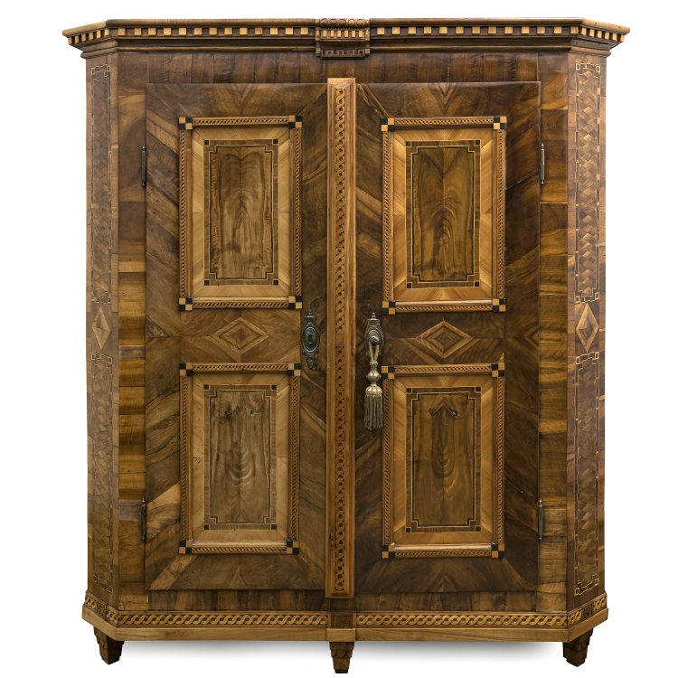 Deutsch, Louis seize. Nussbaum und andere Furnierhölzer. Auf Vierkantfüßen zweitüriger Korpus mit Eckschrägen, Türen mit Kassettenfüllungen, Mäanderleisten, Giebelleiste mit Zahnstab. Lichtschaden linke Seite, rest. 203 x 181 x 62 cm, Innentiefe 54 cm, drei Fachböden.