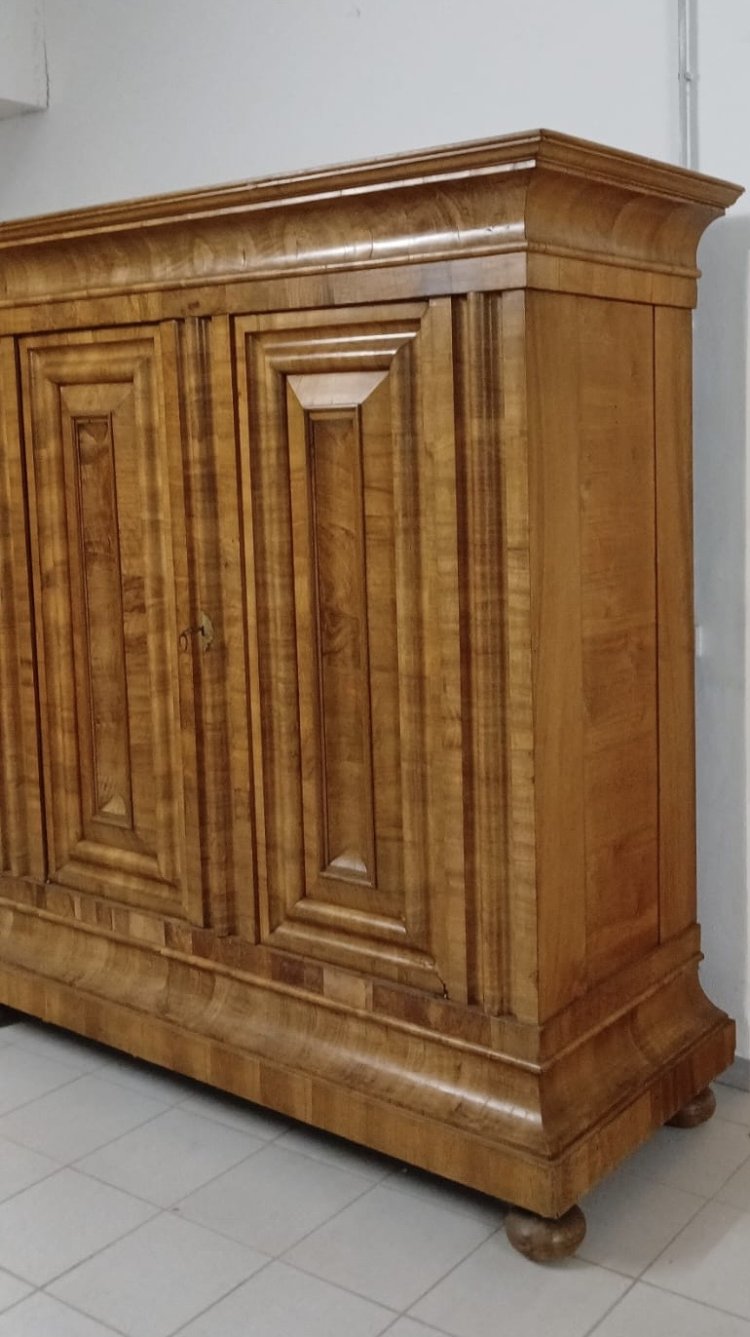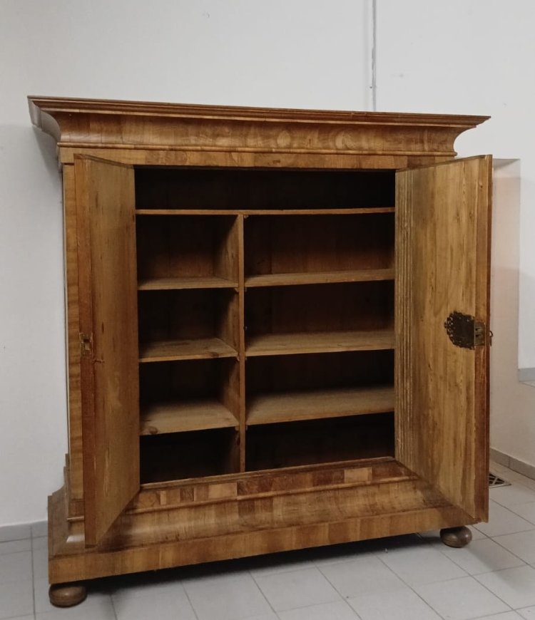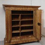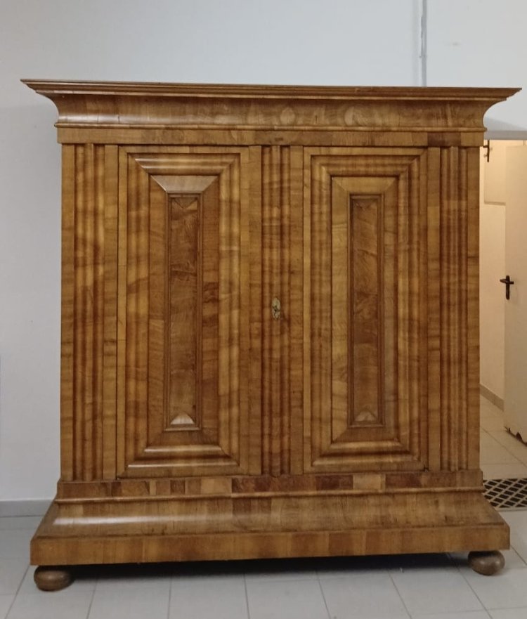 Frankfurt, 18. Jh. Nussbaum, furniert. Auf Scheibenfüßen zweitürigiger Korpus mit konkav einschwingender Sockel- und Giebelzone, innen vier Fachböden. 208 x 180 x 66 cm