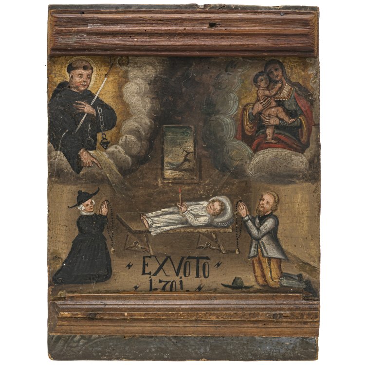 Alpenraum, dat. 1701. Gnadenbild Maria Hilf und Hl. Leonhard. Betende Votanten für erkranktes Kind. Tempera/Holz. 31,5 x 24 cm.