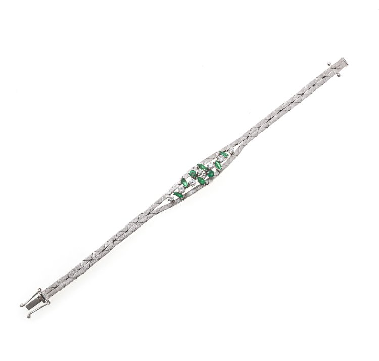 14 K WG (gestempelt). Geschmeidiges Milanaisearmband mit Rautenmuster, mittig mit geschliffenem Smaragd- und Brillantbesatz (8 Smaragde, zus. ca. 1,90 ct) sowie 8 Brillanten (zus. ca. 0,68 ct). Ca. 22 g. L. 18 cm.