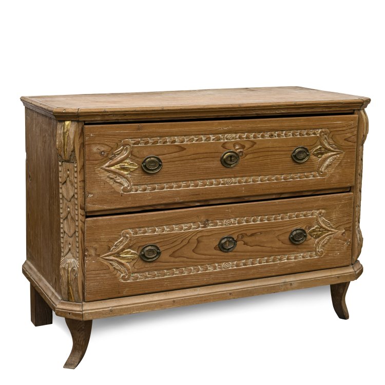 Irschenberg/Oberbayern, 19. Jh. Fichte, massiv. Zweischübig, Eckschrägen und Türfüllungen mit ornamentalen Schnitzarbeiten, Details vergoldet. Alterungsspuren, rest., erg., Beschläge erg. 75 x 104 x 48 cm.