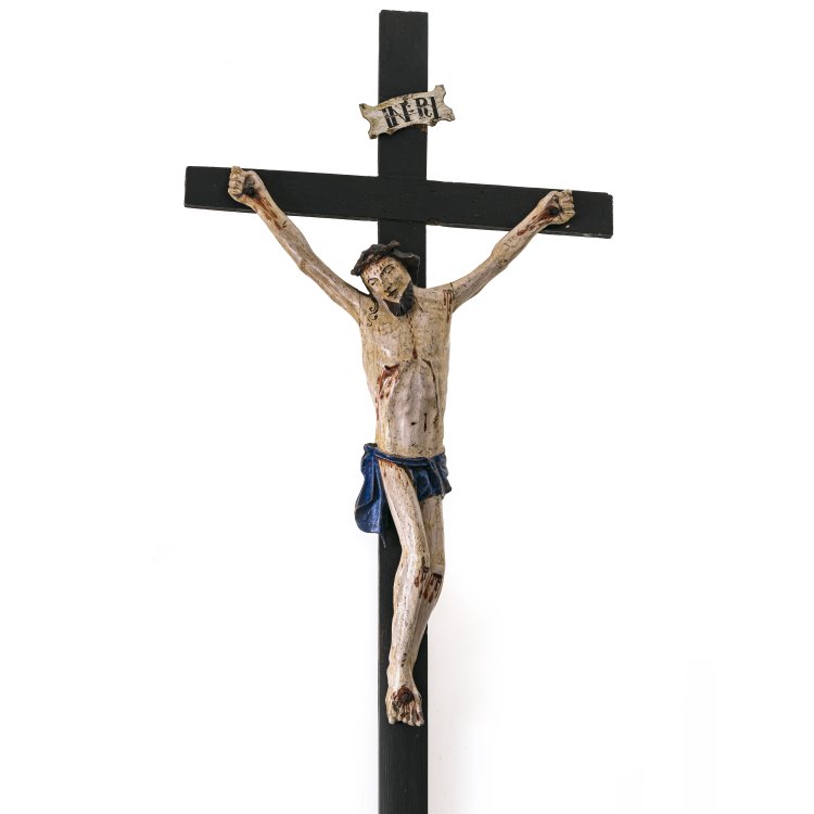 Oberammergau, 19. Jh. Holz, Farbfassung. Dreinageltypus. Min. besch. Gesamthöhe 69 cm, H. Corpus 38 cm.