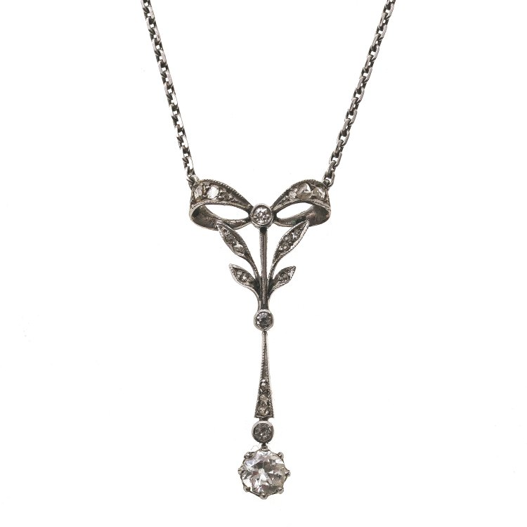 14 K WG (getestet). Schleifenform mit Blattstängel im Art déco-Stil mit winzigem Diamantbesatz, daran anhängender Diamant (ca. 0,25 ct, Farbe M/NO). L. Anhänger 3 cm, L. Kette 44 cm.