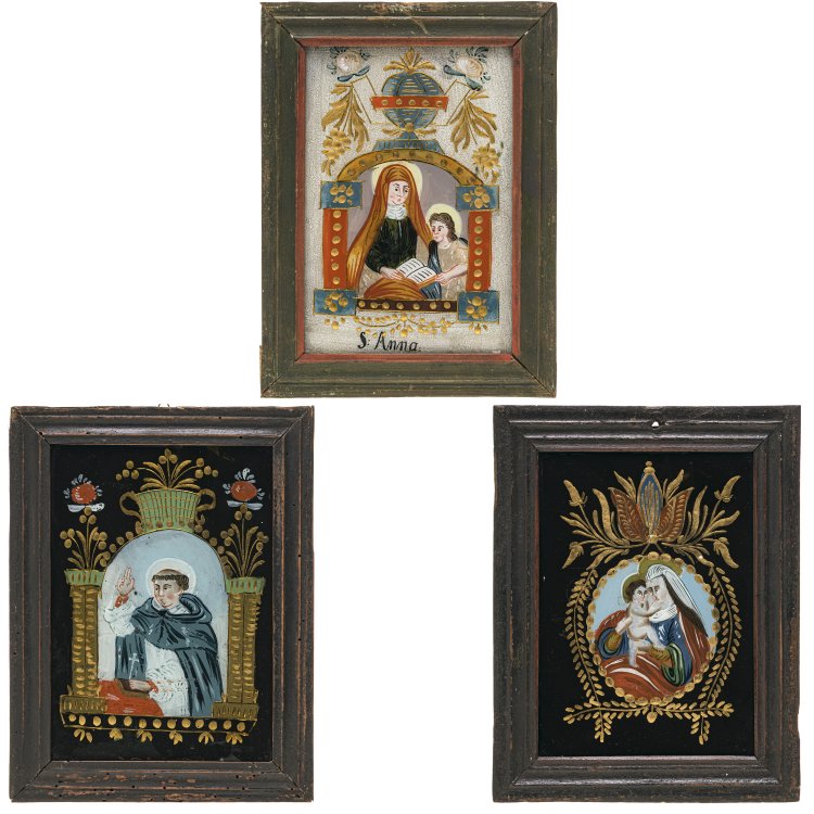 1. Jh. Maria Hilf, hl. Aloysius und Anna mit Maria, das Lesen lehrend. Tempera/Glas mit Schliffdekor, vergoldet. Rest. Je ca. 19 x 13 cm.