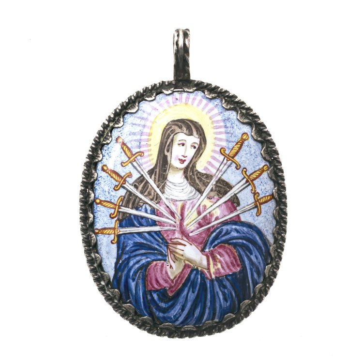 Süddeutsch. Doppelseitig gearbeitet mit farbiger Emailmalerei, Zackenrandmontierung. Mit Mater dolorosa bzw. hl. Theresa von Avila. Tragespuren. L. 5 cm.