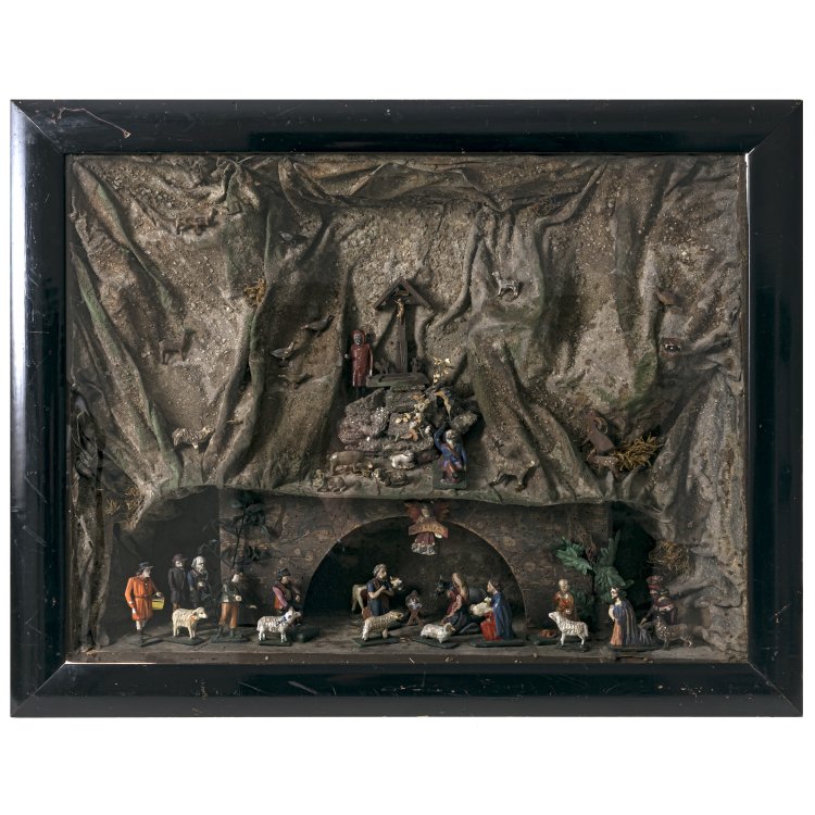 Erzgebirge, 19. Jh. Holz, Papier, Modelliermasse (?), Naturalien und Glimmer. Auf zwei Ebenen, u.a. Anbetung der Hirten und Hl. Drei Könige. Front verglaster Kasten. Leicht besch. Kasten 47 x 62 x 15 cm, Rahmenmaß 55,5 x 71 cm.