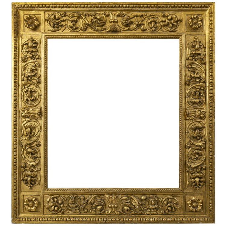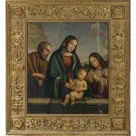 Wohl 16. Jh. Madonna mit zwei Heiligen (Sacra Conversazione). 82 x 72 cm. Öl/Holz. Rücks. altes Wachssiegel. Riss, besch., rest. Unsign. Mit geschnitztem, italienischen Prunkrahmen, Vergoldung erneuert.