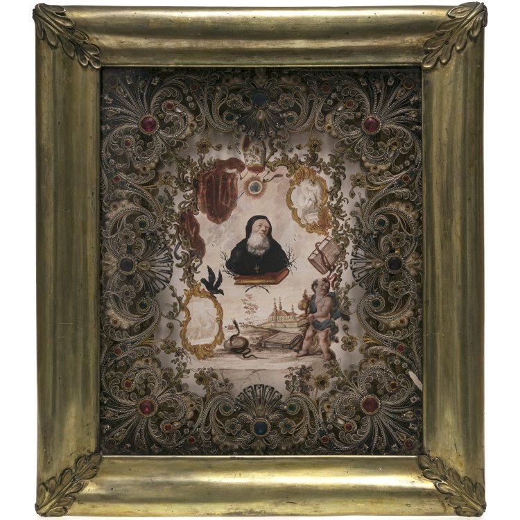 Aquarell Abt Benedikt von Nursia, gerahmt von Klosterarbeit in sog. Edertechnik, Rahmen mit Messingblechauflage. 46 x 40,5 cm.