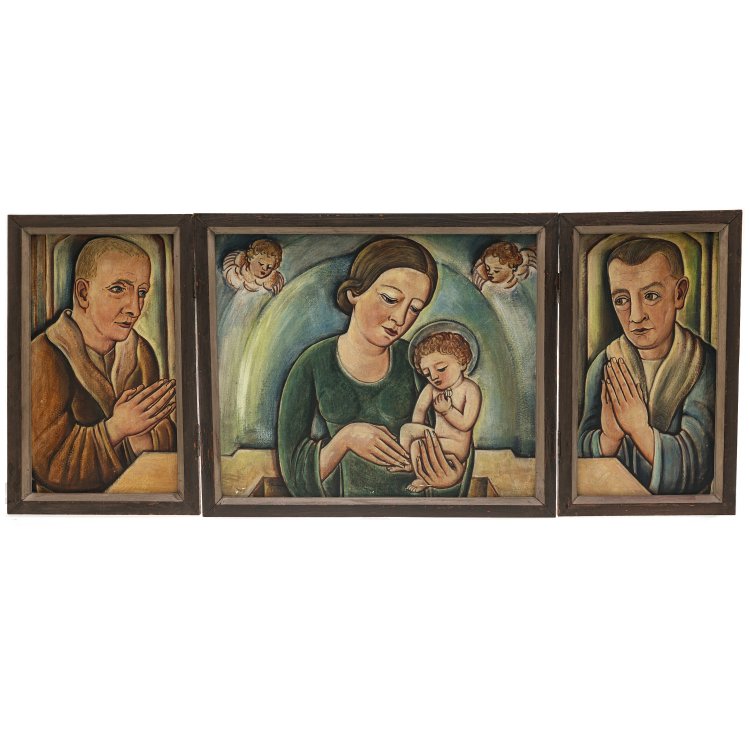 Triptychon. Wachskasein/Karton. 34 x 40,5 cm und je 34 x 18,3 cm. Mittig Maria mit dem Kind auf dem Arm, flankiert von zwei Engeln. Links Alfred Kubin, betend unter einem Segmentbogen, rechts Selbstporträt von Wörlen. Sign., dat. 1928. Mittig im unteren Bereich kleiner Farbabrieb. Seitenteile rücks. Monogr. und bez. "Auf dieser Tafel Selbst" und "Auf dieser Tafel Alfred Kubin".