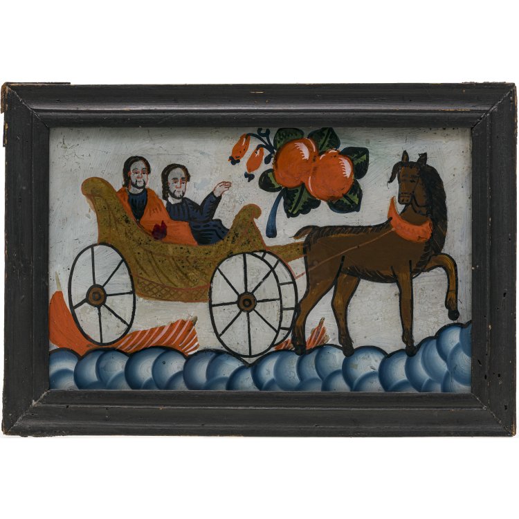 1. Jh. Christus und Gottvater im Himmelswagen. Tempera/Glas. Rest. 17,5 x 28,5 cm.