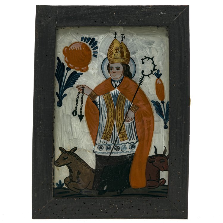 Sandl/Buchers, 19. Jh. Hl. Leonhard. Tempera/Glas. Leicht besch., min. Kratzspur. 25 x 17 cm.