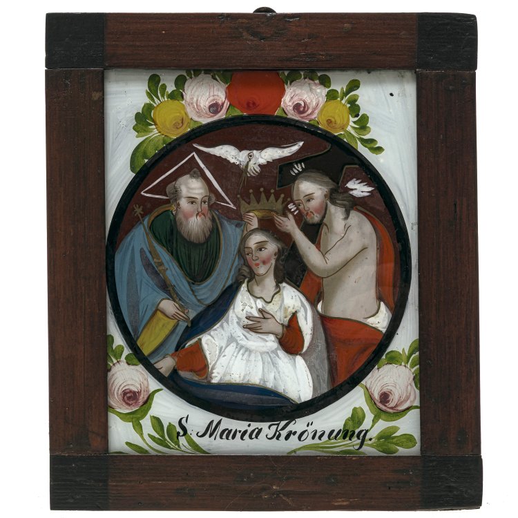 Oberammergau, 19. Jh. Krönung Mariä. Tempera/Glas. Rahmen rest. 22 x 18 cm.