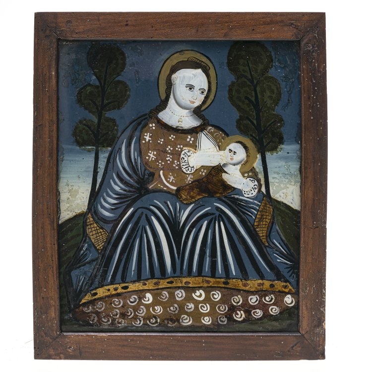 Um 1800. Maria mit dem gefatschten Jesuskind im Arm, von zwei Bäumen flankiert. Tempera/Glas, Details in Goldbronze. Leicht besch., rest. 30,5 x 25,5 cm.