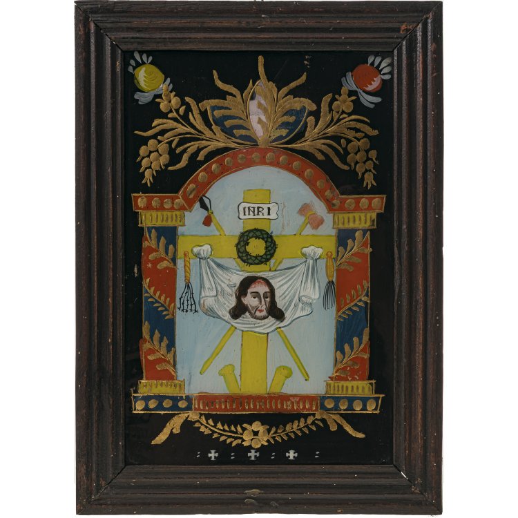 Sandl/Buchers. Kreuz mit Arma Christi im Portalrahmen mit Schliff- und Golddekor. Farbablösungen. 26 x 17 cm.