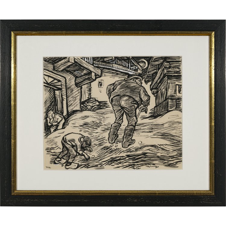 "Auf dem Heimweg". Tuschzeichnung mit weißer Deckfarbe erhöht. 29 x 35,5 cm. Sign. In Passepartout und gerahmt.