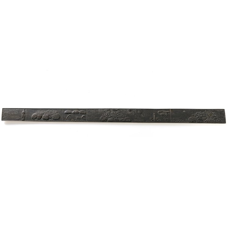 Flachrelief aus Bronze. Diverse Darstellungen in zeitl. Reihenfolge: Gründung der Stadt Landau 1224 durch Ludwig den Kelheimer, Nennung des Landshuter Erbfolgekriegs 1504, Erbfolgekrieg von 1743 und der große Krieg von 1945. Pflügender Bauer, Schafhirte, Bewahrung vor der Pest und Stadtansichten. 4,3 x 62 cm. Sign. und dat. 73.