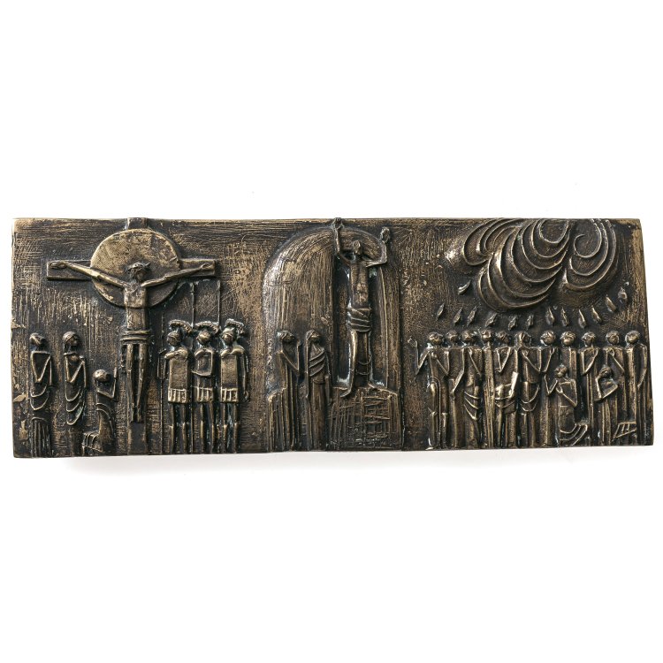 Große Bronzeplakette, mit Aufhängung. Darstellungen der Kreuzigung Jesu Christi, der Auferstehung Christi und des Pfingstwunders. Sign. und dat. 76. 10 x 27 cm. Patina, poliert.