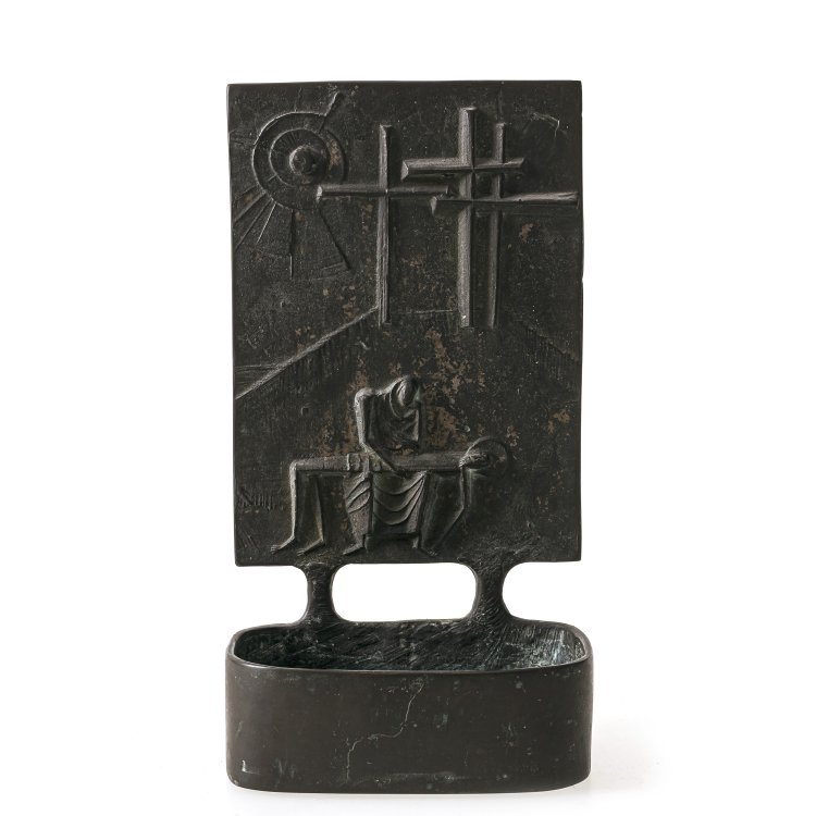 Weihwasserbecken, Bronze. Darstellung des Berges Golgotha und Pietà im Vordergrund. 23 x 12,2 cm. Patina.
