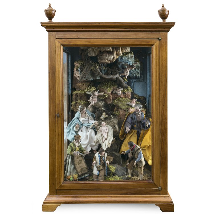 1. Jh. Heilige Familie mit Frau und zwei Hirten, zwei schwebende Engel und zwei Puttenköpfe, Köpfe von Ochs und Esel. Terrakotta, farbig bemalt, Holz, Bastumwickelung, textile Bekleidung. Kulisse in Form einer Felsennische aus Holz, Baumschwamm, bemalt, Naturalien. Alterungsspuren, min. rest. Kasten später, Kirschbaum, furniert, mit Vasen bekrönt, 78 x 49 x 40 cm, H. Figuren 9-31 cm.