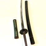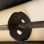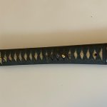 Japan. Japan. Saya in schwarzem Lack (besch), mit goldenen Ranken, Kojiri mit Silbereinlage. Griff mit feinkörniger Same (Riss) und Seidenwicklung (besch). Mit je einem beidseitigem Menuki in der Darstellung eines Fisches in Wellen. Fuchi und Kashira in Kupfer. Ein Mekugi-ana, Angel unsign. Habachi Silber. Klinge L. 90 cm. Tsuba in Eisen, mit fliegendem Vogel und Blüten.