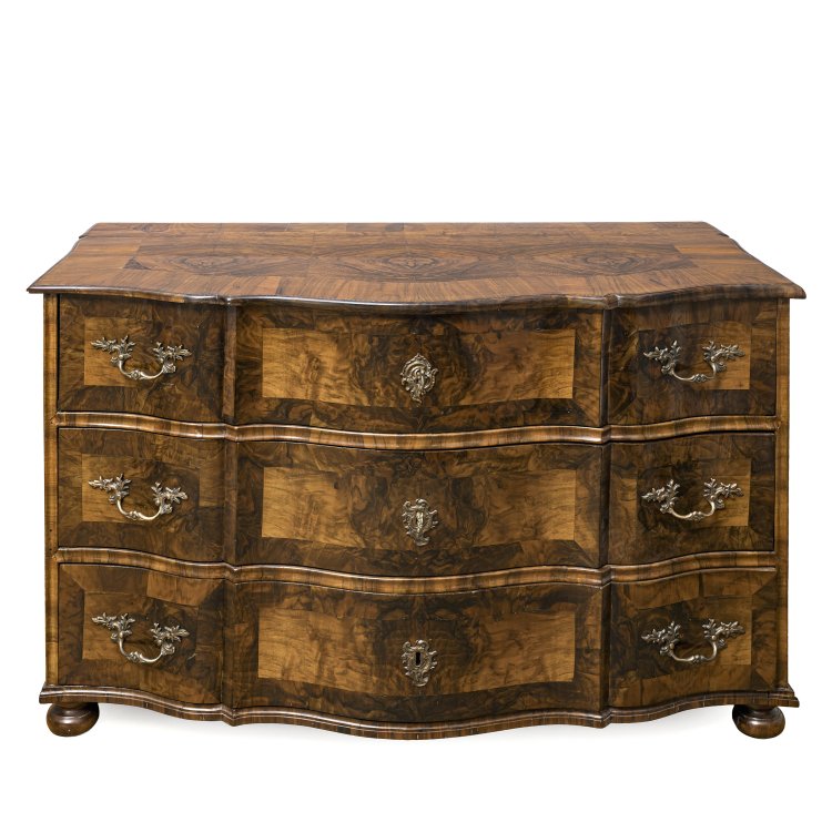 Süddeutsch, Barockstil. Nussbaum mit Wurzelmaserung, furniert. Auf Scheibenfüßen dreischübiger, doppelt geschweifter Korpus. Leicht besch. 78 x 126 x 64 cm.