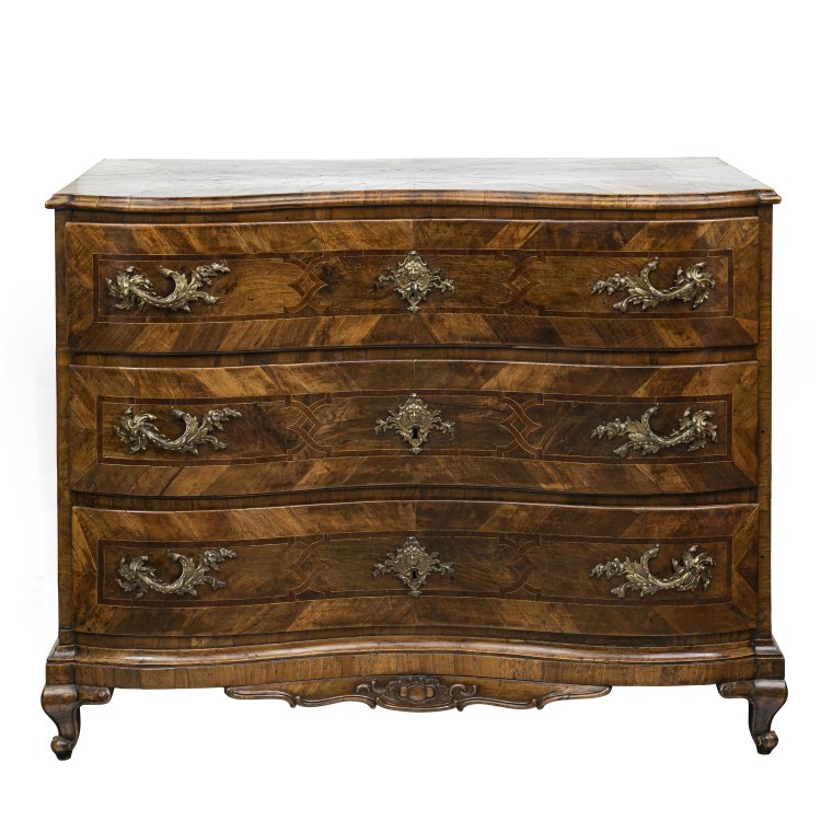 Süddeutsch, 18. Jh. Nussbaum, furniert, Bandeinlagen. Doppelt geschweifter Korpus mit drei Schüben, geschnitzte Zarge. Alterungsspuren, rest. 88 x 110 x 58 cm.