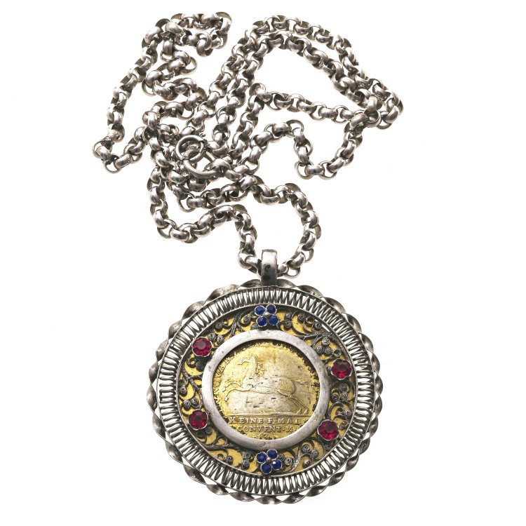 Süddeutsch. Silber, Filigranarbeit mit rotem und blauem Glassteinbesatz, mittig vergoldete Münze "Eine F Mark" mit springendem Pferd (berieben). Großgliedrige Erbskette, Schließe verändert, L. 39 cm, ø Anhänger 6 cm.