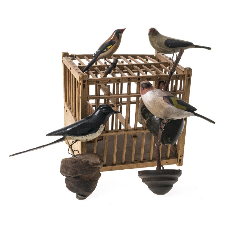 Alpenländisch, 19. Jh. Vier einzelne Vögel, geschnitztes Holz mit naturalistischer Bemalung. Diverse Größen. Vogelbauer in Miniatur aus Holz, ca. 16 x 16 x 12 cm. Alterungsspuren, teilw. besch.