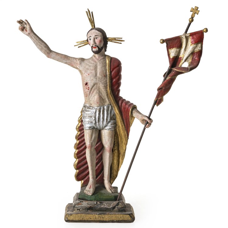 Bayern, Anfang 19. Jh. Holz, übergangene Farbfassung. Die Fahne in seiner linken Hand haltend, stilisierter Faltenwurf seines über dem linken Arm gerafften Mantels. H. 38 cm.