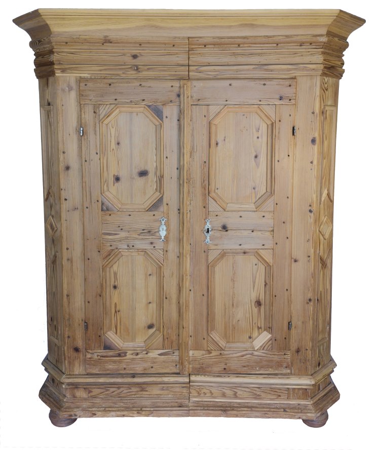 Barockbauernschrank Naturholz Salzburger Art, um 1770 entstanden. Weichholz, ehemalige schadhafte Bemalung abgenommen. Gesims abnehmbar. Steckkeilverbindung. Innen ohne Ablagen.