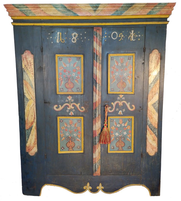Bauernschrank aus Bayerischen Wald, Gegend um Langdorf / Zwiesel , datiert 1794/1804. Doppeldatierung wegen Zweitverwendung, vermutlich als Hochzeitsschrank Weichholz mit freigelegter Originalbemalung. Sims oben ergänzt. Innen Mittelwand mit zwei Ablagen. Schloss original, restauriert. 184 x 149 x 51 cm.