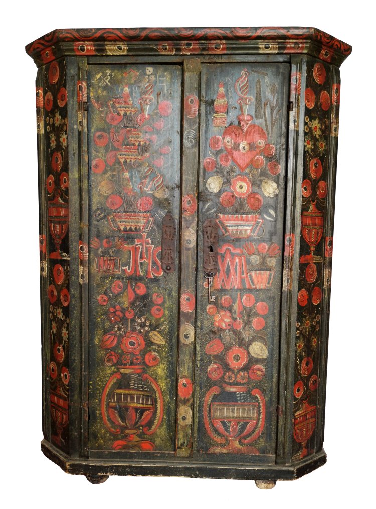 Bad Tölz, um 1820. Weichholz, sehr reiche Bemalung. Zweitürig mit Eckschrägen auf Kugelfüßen, reicher Blumendekor sowie Christus- und Marienmonogramm, Korpus gemoost. Innen ohne Einteilung, Schloss ergänzt, restauriert. 160 x 115 x 47 cm.