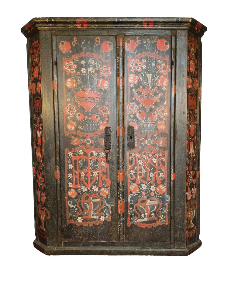 Bad Tölz, datiert 1812. Weichholz, sehr reiche Bemalung. Zweitürig mit Eckschrägen auf Kugelfüßen mit seitlichen Tragegriffen, reicher Blumendekor sowie Christus- und Marienmonogramm, Korpus gemoost. Innen Ablagebretter (erg.), Schloss original restauriert. 165 x 128 x 48 cm.