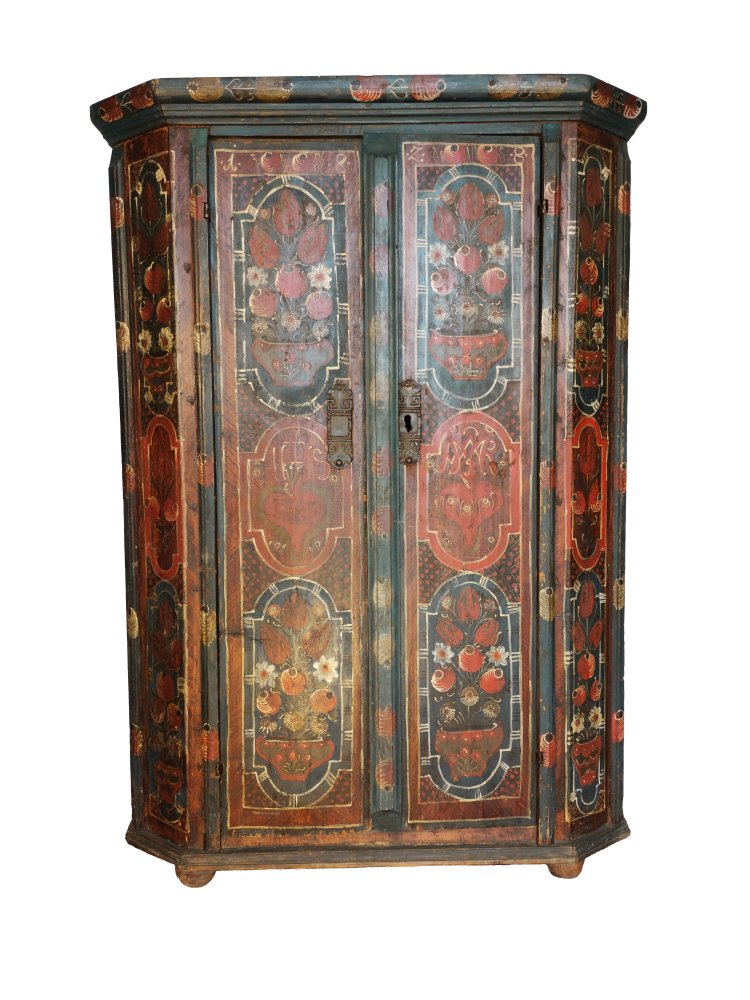 Bad Tölz, datiert 1828. Weichholz, sehr reiche freigelegte Intarsien- und Blumenbemalung. Zweitürig mit Eckschrägen auf Kugelfüßen,. Innen originale Einteilung mit Schublade, Schloss ergänzt, restauriert. 161 x 112 x 45 cm.