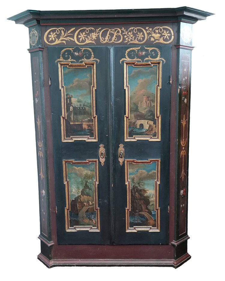 Bauernschrank, Oberösterreich, sog. Vedutenschrank um 1780. Zu späteren Zeit vermutlich zur Verwendung als Hochzeitsschrank mit Rocaillen- und floraler Bemalung ergänzt, dat. 1839. Original Inneneinteilung vorhanden. Ein vergleichbarer Schrank, sogen. "Steinhauerschrank" ist im Besitz des OÖLM im Freilichtmuseum Samesleiten. Schloss original, restauriert. 193 x 147 x 79 cm.