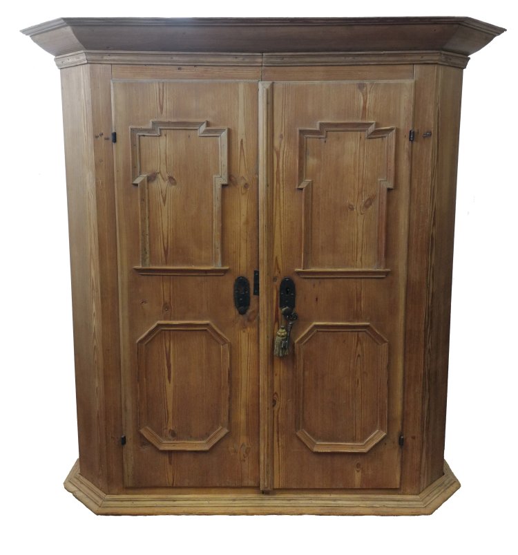 Barockbauernschrank Oberbayern, Naturholz , um 1750 entstanden. Weichholz, ehemalige schadhafte Bemalung abgenommen. Gesims und Sockel abnehmbar, Korpus teilbar. Innen mit Ablagen (erg.),