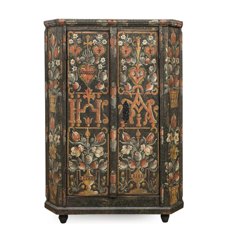 Bad Tölz, 19. Jh. Nadelholz, farbige Bemalung. 2-türig mit Eckschrägen. Herz Jesu- und Herz Mariämotive sowie Blumenvasendekor. Besch., rest., erg. 156 x 112 x 48 cm, Fachbodentiefe 39 cm, Bretter erg.