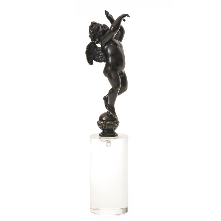 Frankreich, Ende 19. Jh. Figur eines Putti, Bronze mit Patina. Auf Acrylständer montiert. H. Bronze 16 cm, Ständer 10 cm. Minim. berieben.