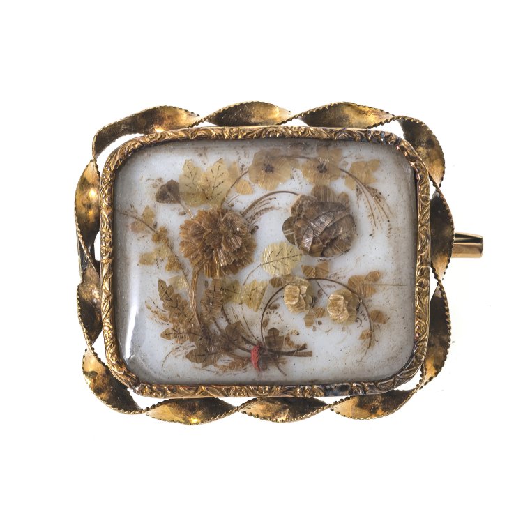 1. Jh. Silber, vergoldet. Blumenstrauß aus fein geschnittenen Naturalien, verglaster Rahmen mit gedrehtem Kordelrand, rückseitig gravierter Muscheldekor. L. 3,8 cm.