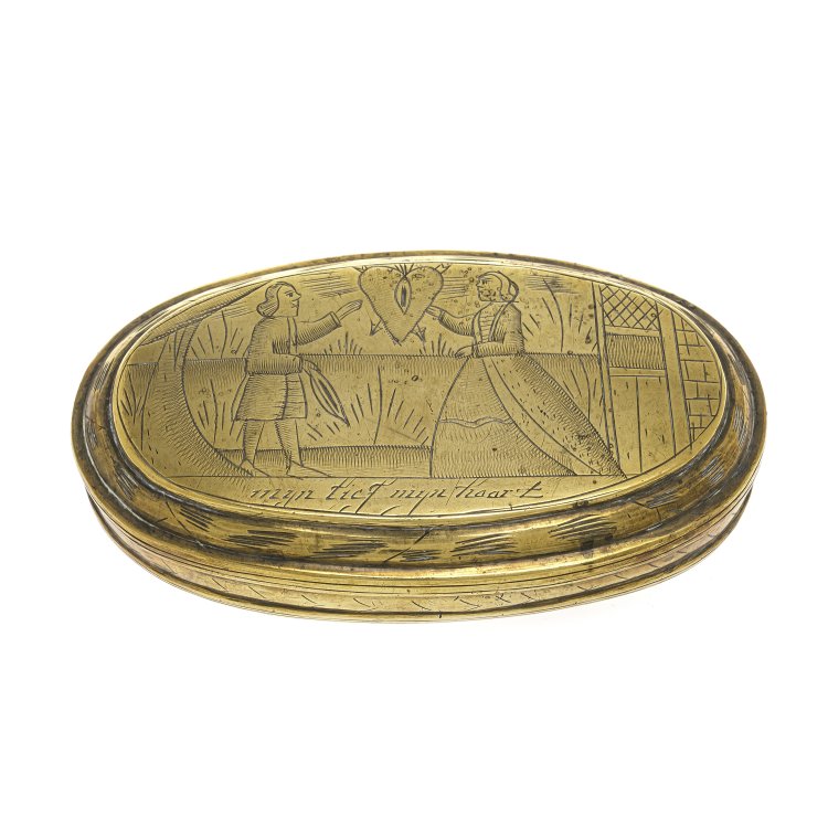 Holland, um 1800. Messing. Oval, scharniert, beidseitig mit Liebespaarmotiven und Begleitschrift. 3,5 x 12,5 x 7 cm.