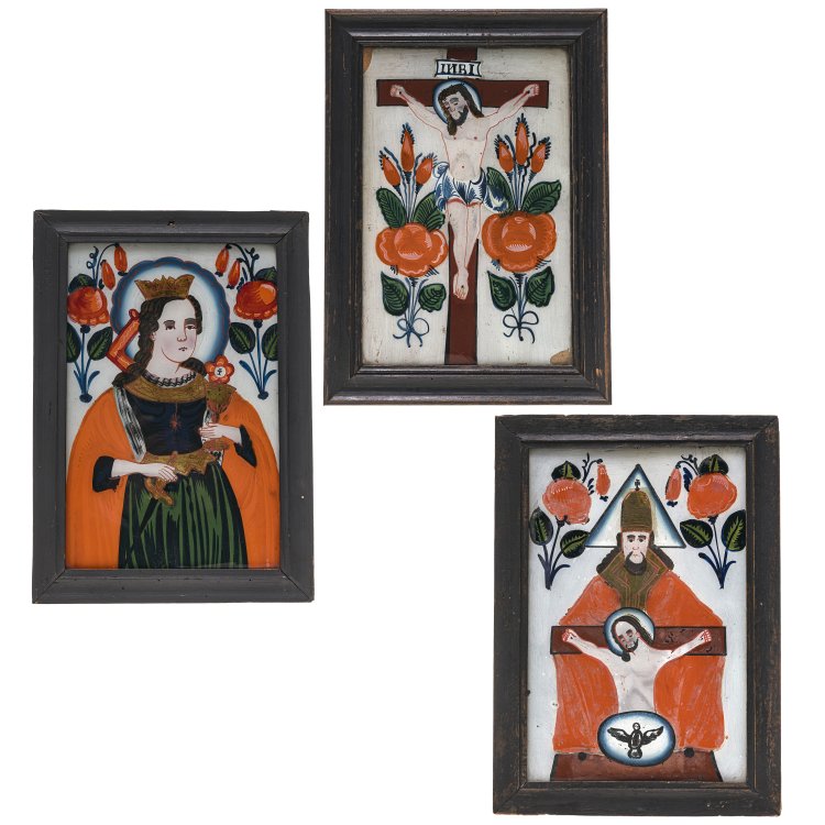 1. Jh. und später. Gnadenbild von Sonntagberg (Hl. Dreifaltigkeit), Christus am Kreuz und hl. Katharina. Tempera/Glas. Tw. rest., eine Glasecke fehlt. Je ca. 29 x 19 cm.