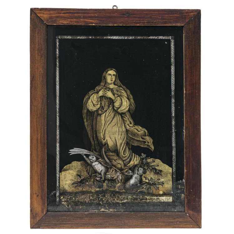 Böhmen/Tschecheslowakei, um 1800. Hl. Maria Magdalena, zu ihren Füßen Putten mit Blattwerk. Gold, Silber, radiert, Schwarzlot/Glas. Leicht besch. 35 x 25 cm.