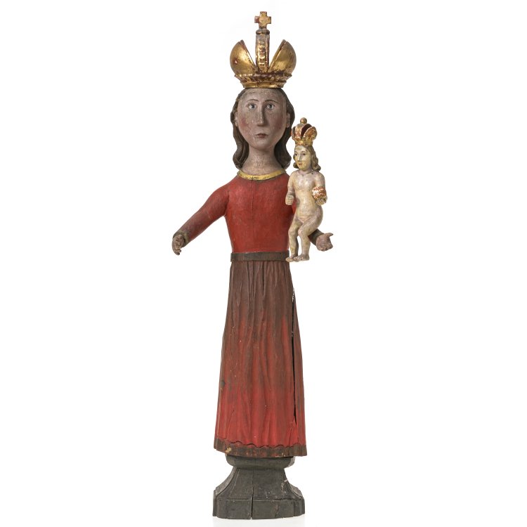 Niederbayern, 19. Jh. Holz, Farbfassung. Statuarischer, streng frontal ausgerichteter Marientypus im roten Mieder, das Kind auf ihrem linken Arm ballancierend. Holz mit Rissen, rest. H. 67 cm.