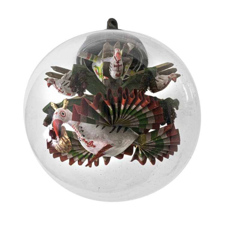 Bayerischer Wald. Farbloses Glas, Eingericht mit aufwändig gestalteter Heiliggeisttaube, Holz- und Papierarbeit. Zusätzlich sechs kleine Tauben im Strahlenkranz. H. ca. 18,6 cm. Guter Erhaltungszustand.