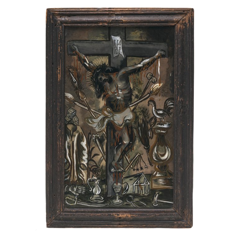 Böhmen. Christus am Kreuz mit den Arma Christi. Expressive Darstellung. 44 x 26 cm. Alter Profilrahmen.
