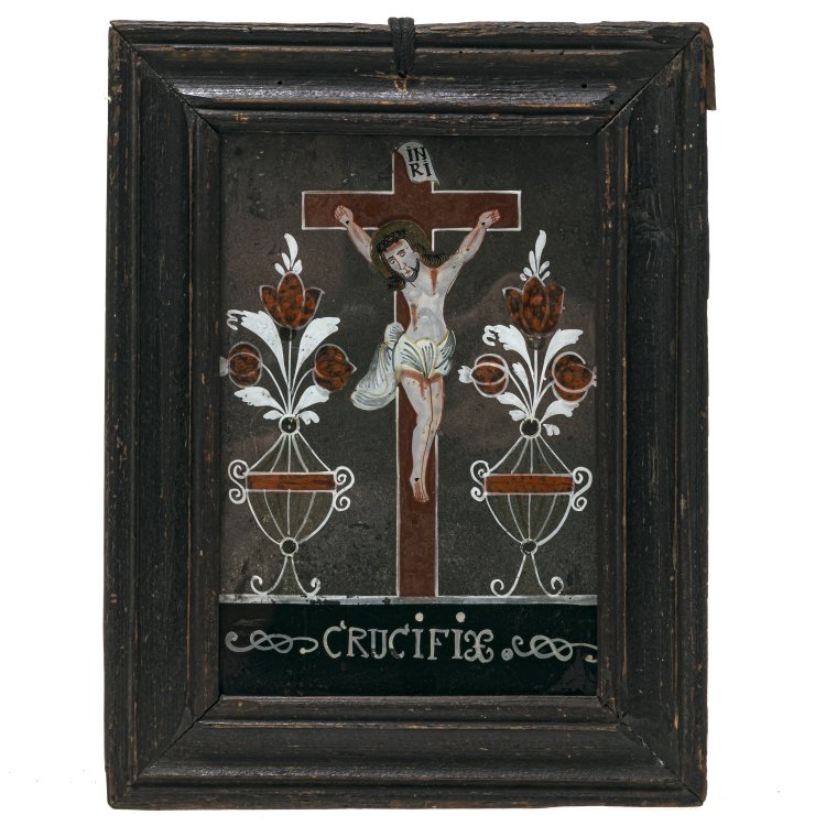 Buchers, 19. Jh. Christus am Kreuz, von Blumenvasen flankiert. Tempera/Glas. Alterungsspuren. 17,5 x 12 cm.
