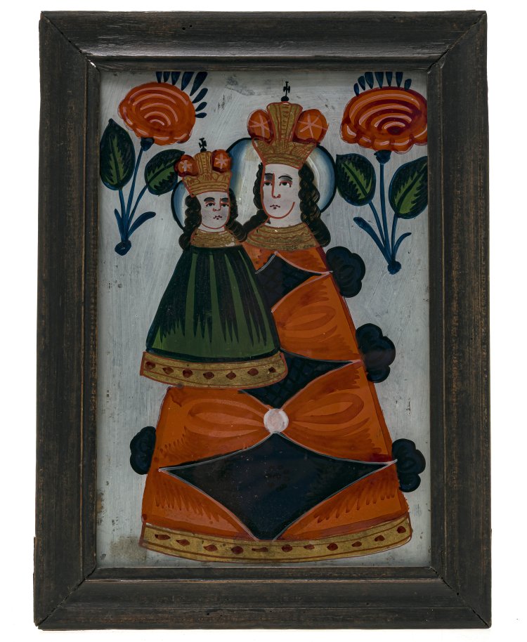 Sandl/Buchers, 19. Jh. Gnadenbild der Maria mit Kind im Kegelmantel. Tempera/Glas. Min. Farbablösung am Rand, rest., Rückwand erg. 25 x 16,5 cm.